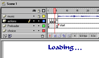 - Now click on the sixth frame in the Preloader layer and give it the label start. That's it your simple preloader is ready. Just make sure that all the stuff that you want to be displayed in your movie starts from the 6th frame and that you label the last frame of your completed movie as "end". Alternatively for Flash 5 and above you can use the following code instead of the code given in the first frame: